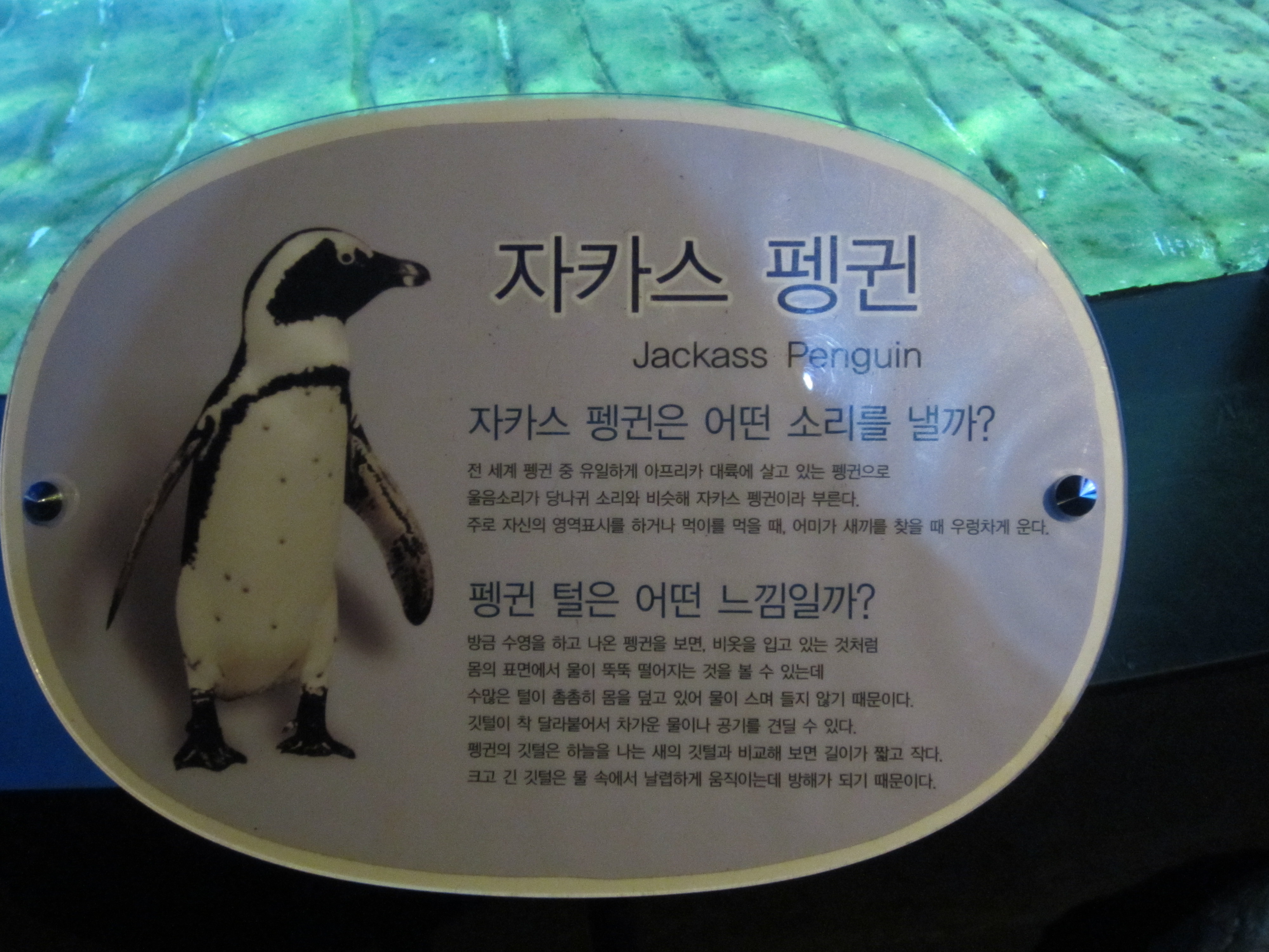 I later discovered that this was not a case of mis-translation, just a nickname for an African Penguin. Crap! I had already come up with a story in my mind about the sign maker, Minjun, being the only person in the aquarium that spoke English, and he was holding a grudge against the little bastards because one of them pooped on his shoe.  I hate it when reality crushes my imagination.  They are actually named because of the braying sound they make, but I am going to blame Minjun.