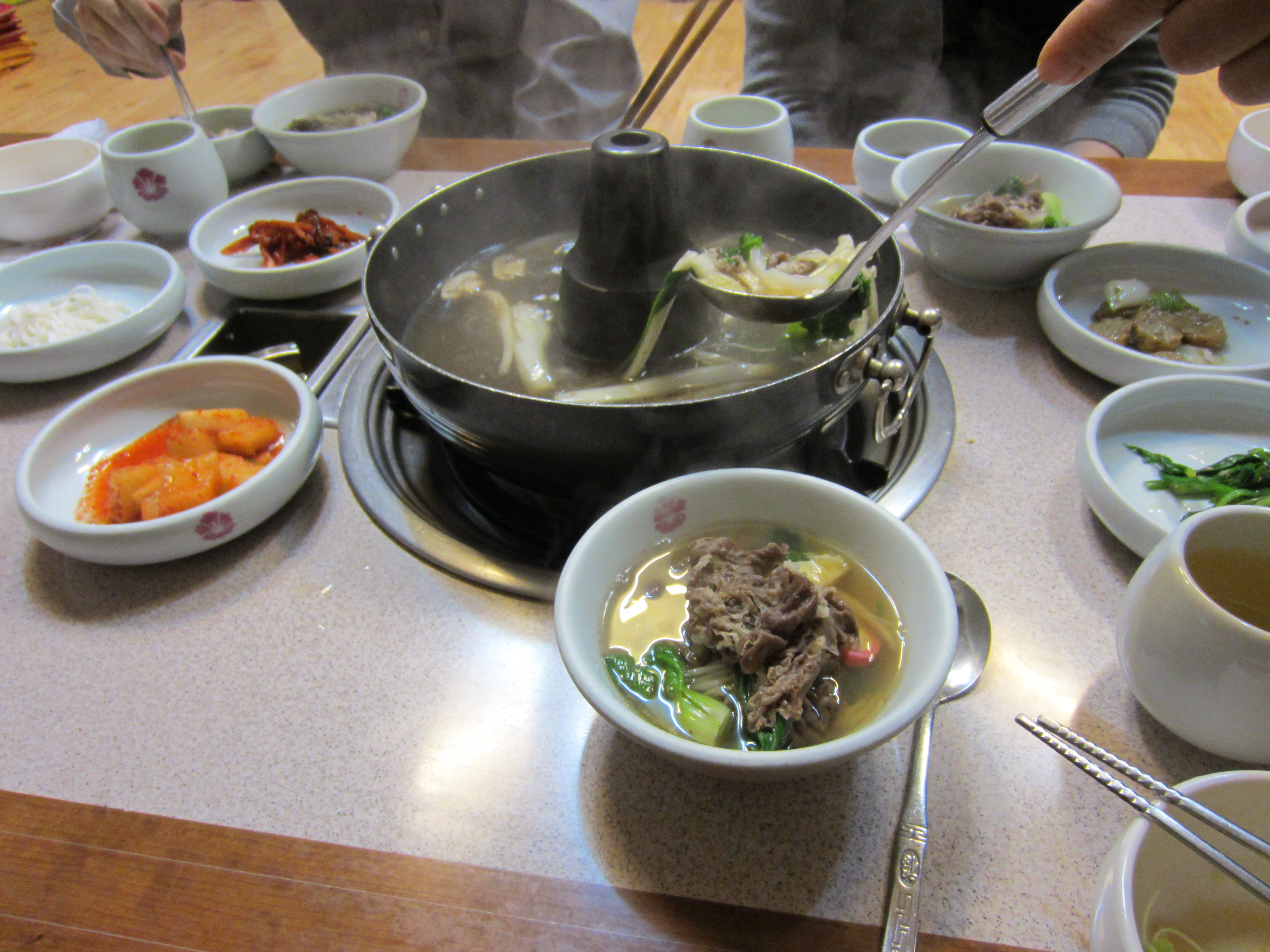 I met up with the rest of the crew (Kathleen, Candice, Kim, Taehoon, Miru) and we headed over to Kim’s Mom’s restaurant for Korean hot pot.  Veggies, thinly sliced beef, and fish cake (I didn’t ask and don’t want to know) were cooked in the broth.  After that course was served, the hot pot was filled with noodles and then it was served.  Then rice and veggies were added to the now very flavorful broth and cooked into a porridge.  Everything was delicious and I was very thankful to experience a very authentic Korean meal at a family restaurant.  Dinner was finished with a slightly sweet cinnamon tea served cold.  It was amazing and I will be making it when I get home!