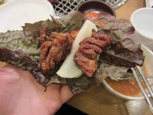 You would take the grilled meat and put it into a lettuce leaf with red bean and chili sauce, radish slices, and any other fun veggies around the table and munch away.  We also roasted garlic right on the grill and ate it straight away.  Needless to say, I walked away smelling like garlic and smokey meat.  So delicious!!