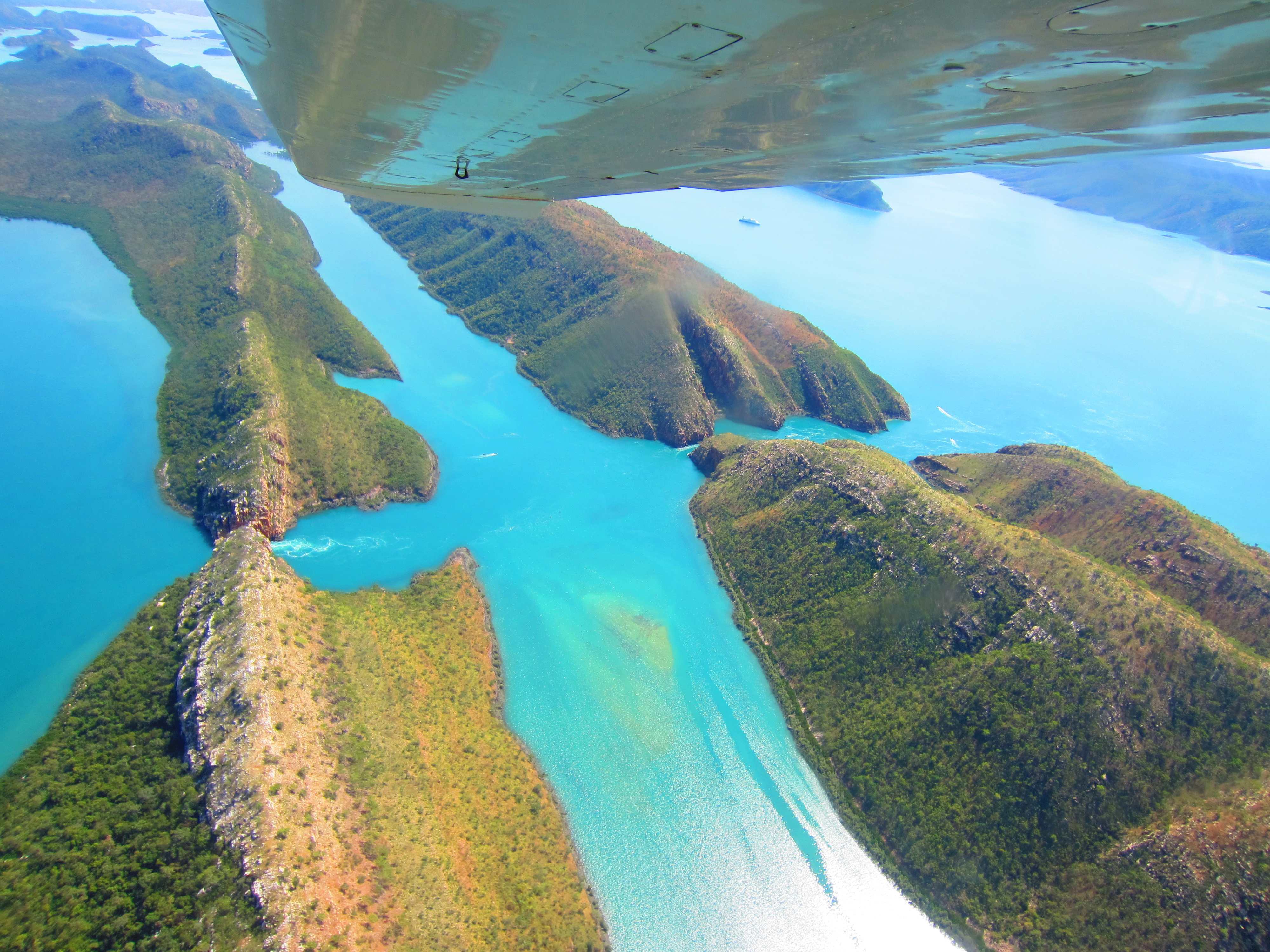 We flew over a remarkable phenomenon called the Horizontal Falls. They are a fast-moving tidal flow through two narrow, closely aligned gorges of the McLarty Range, located in Talbot Bay. The direction of the flow reverses with each change of tide. As tides in the Kimberley can reach 10 metres, a peak tide gives rise to a significant difference in the sea level on either side of each gorge. The tides weren’t moving as much as I would hope, but it was still something to see!
